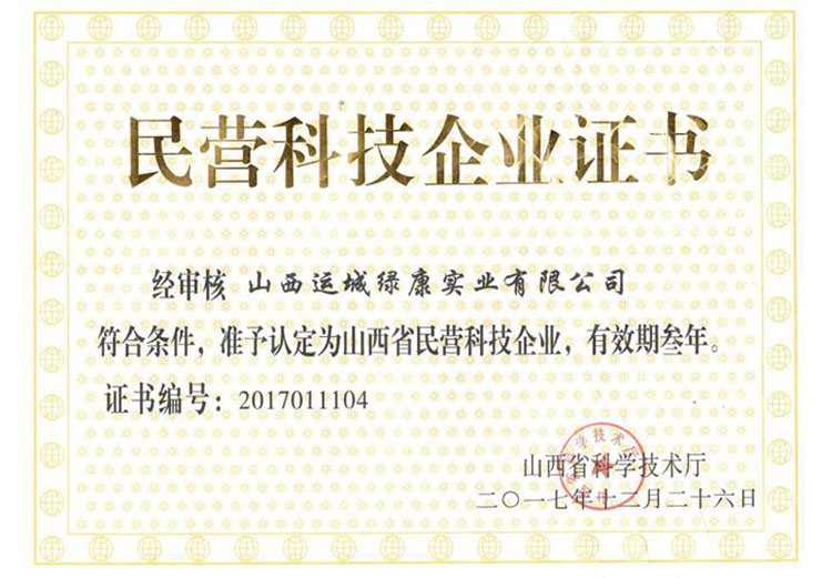 山西運(yùn)城綠康實(shí)業(yè)有限公司喜獲省“民營(yíng)科技企業(yè)”證書(shū)