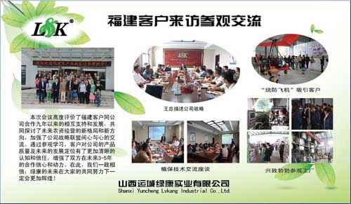 為加大客戶與公司之間的信任度,增加銷量,2014年9月23日,閔北區(qū)業(yè)務經理陳鋒帶領福建客戶來綠康公司參觀學習,由技術總監(jiān)薛工帶領大家參觀生產工廠。首先參觀了我公司用于統(tǒng)防統(tǒng)治的美國三角翼,為了貼合******統(tǒng)防統(tǒng)治的植保理念,為了提高防治病蟲害效果,綠康公司于2012年成立了統(tǒng)防統(tǒng)治合作社,并購置美國原裝進口塔瑞斯MA-34R528XB農藥噴灑飛機五架。客戶在參觀飛機后對公司先進的植保理念表示贊賞。